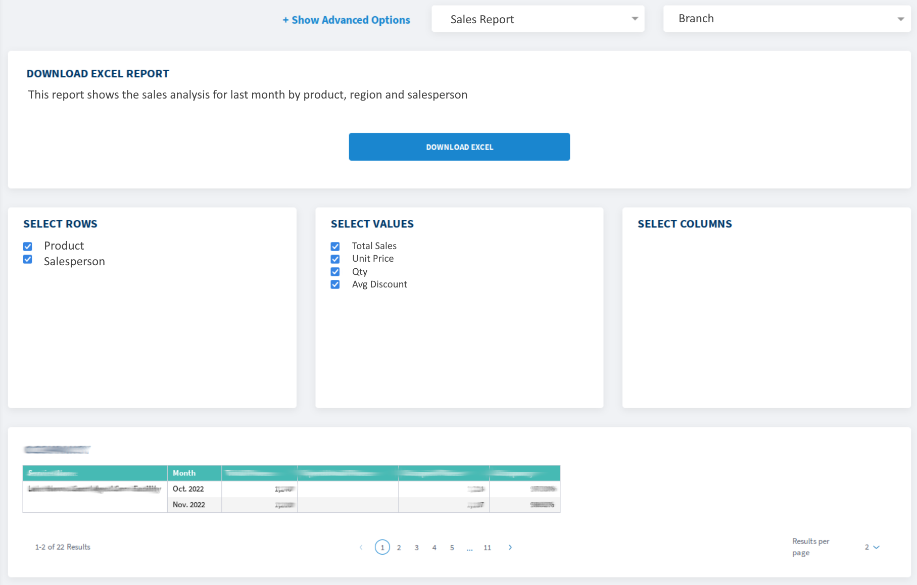 • Designers create report templates, and Viewers can choose a report, filter by configured categories, choose Rows / Values / Columns and Export to Excel